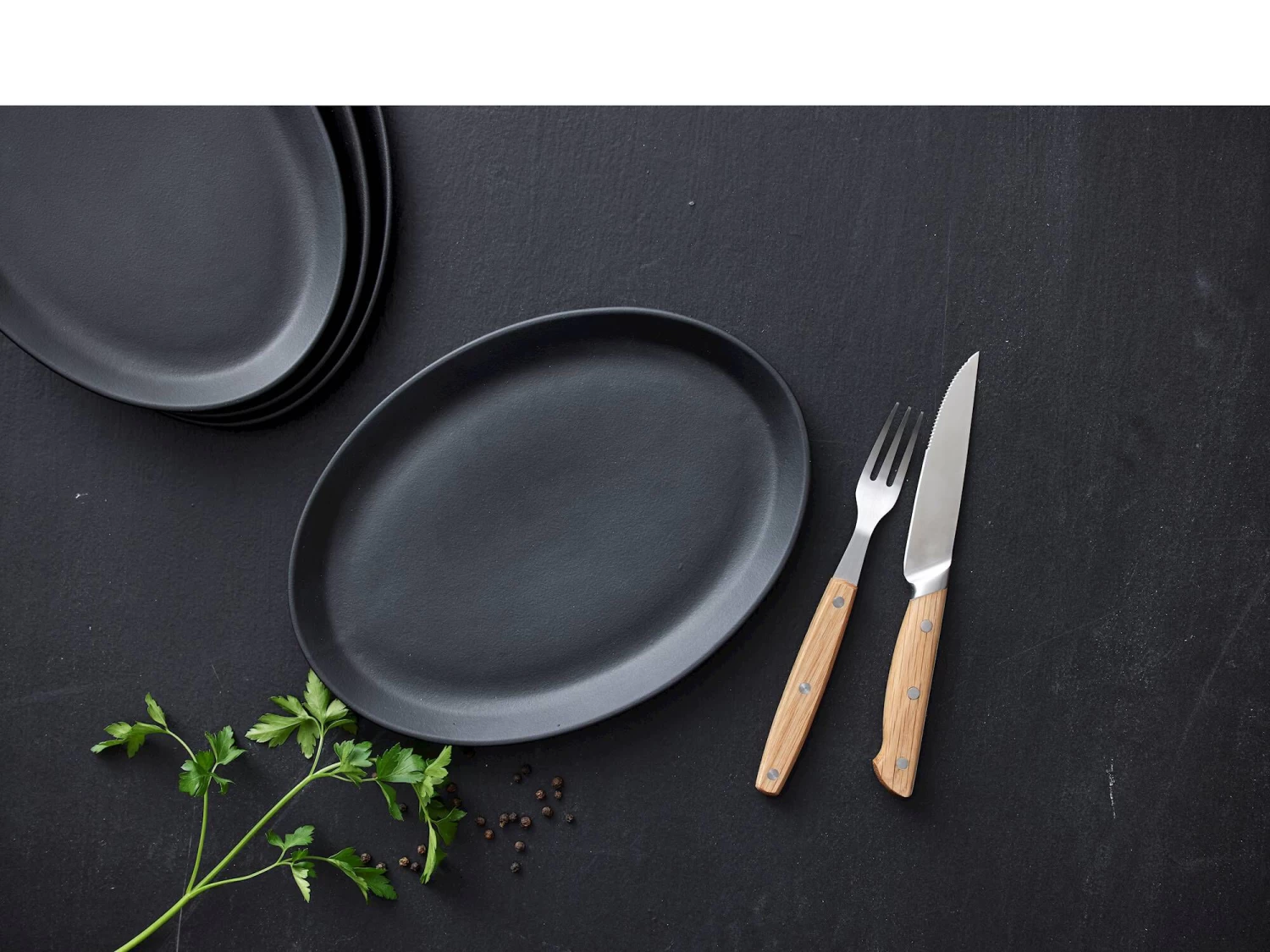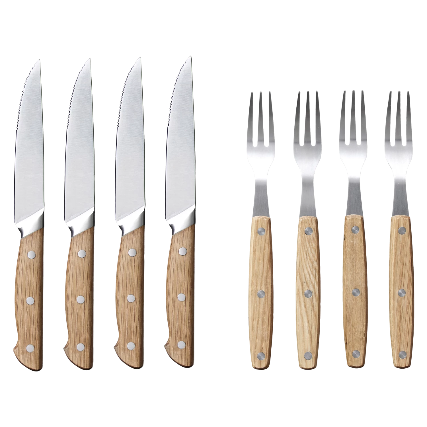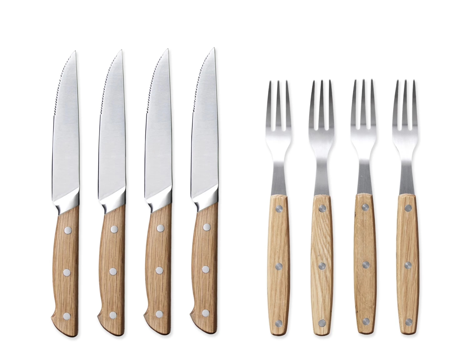 Die Gabel und die Messerklinge bestehen aus Edelstahl und die Griffe aus geölter Eiche, die im Gebrauch Patina entwickeln und umso schöner werden, je mehr das Besteck verwendet wird. Die Holzgriffe liegen angenehm in der Hand.