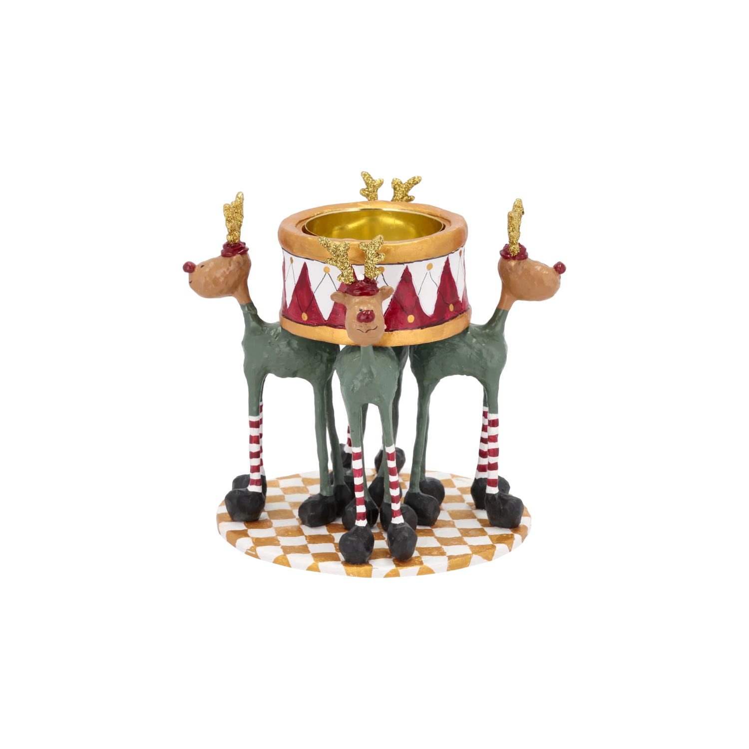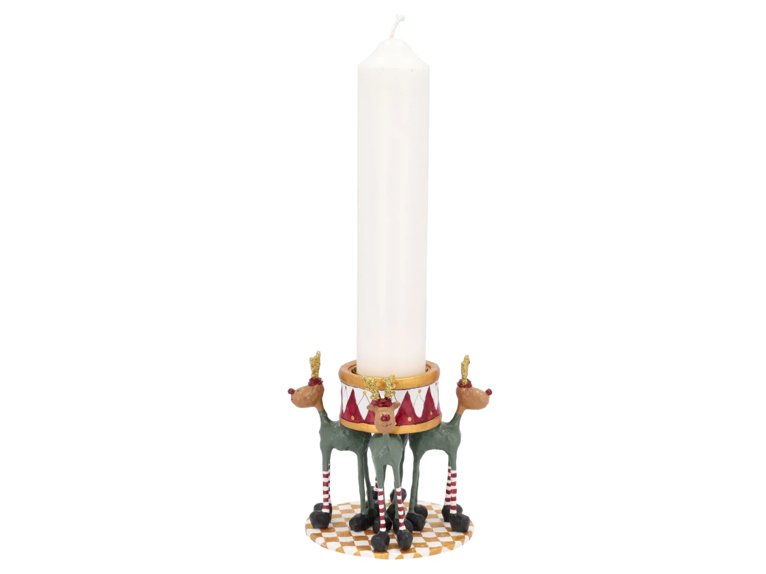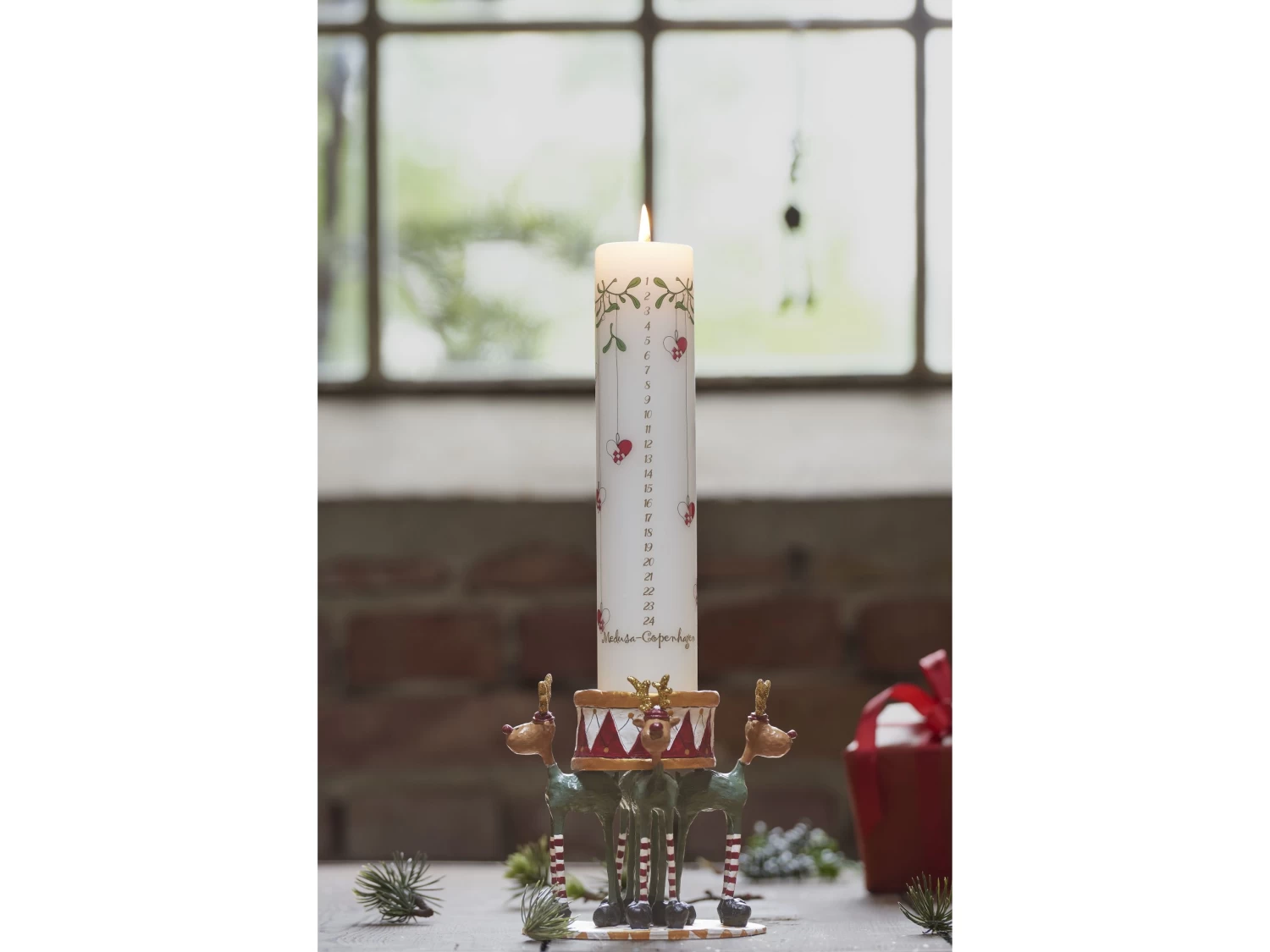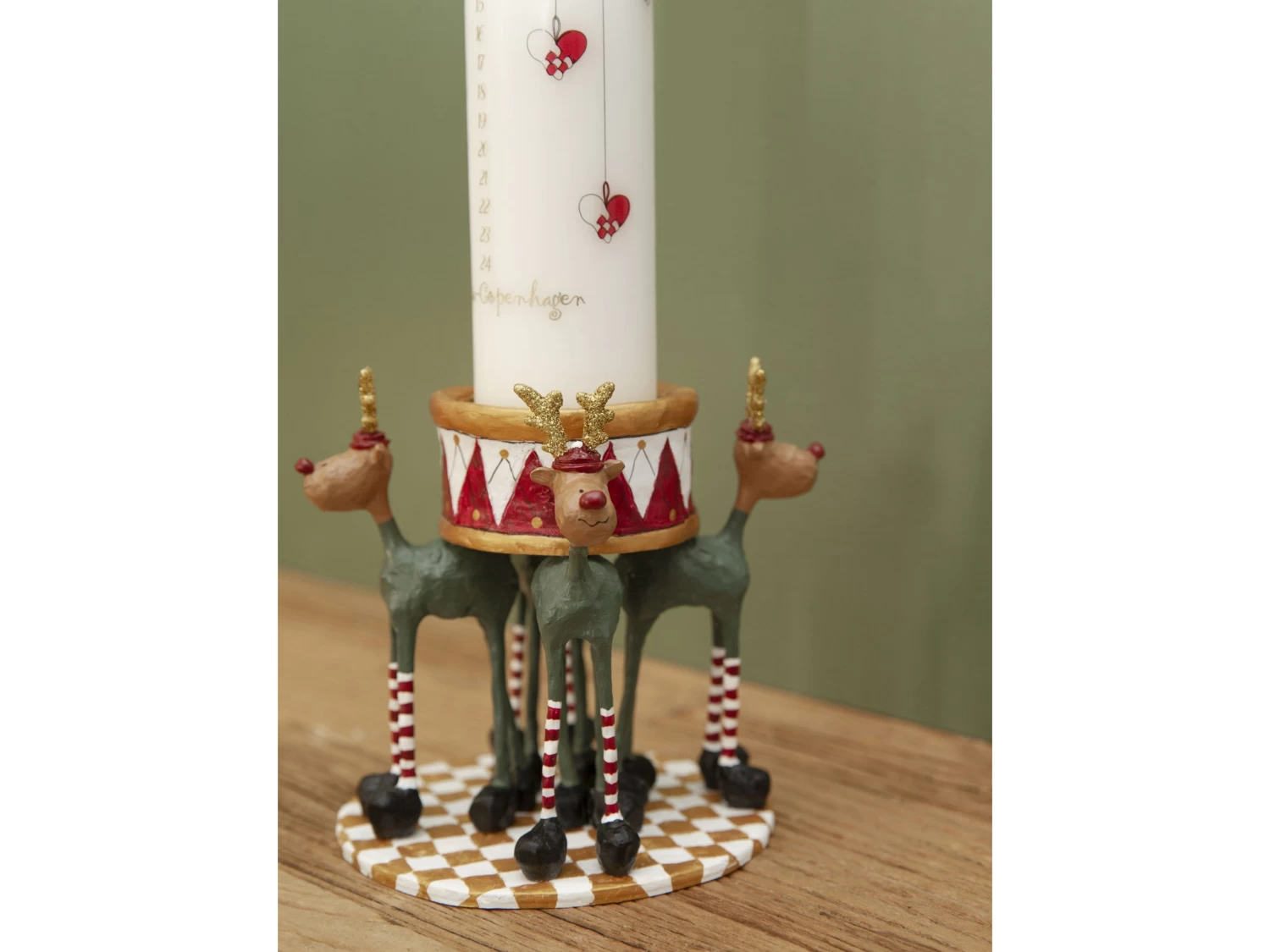 Wenn vier Rentiere im Rudel zusammenarbeiten, gibt es keine Grenzen dafür, was sie tragen können. In fichtengrünen Gewändern, geringelten Bonbon-Strümpfen und mit glitzerndem Geweih tragen sie die große Trommel, in die sie Ihre Kalenderkerze unbekümmert hineinstellen und bis Heiligabend herunterzählen können.