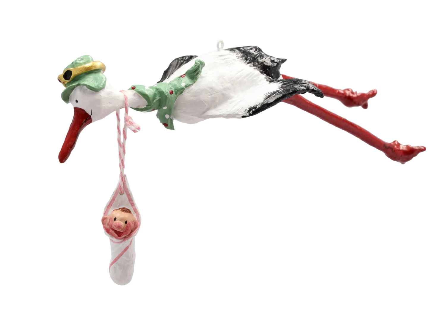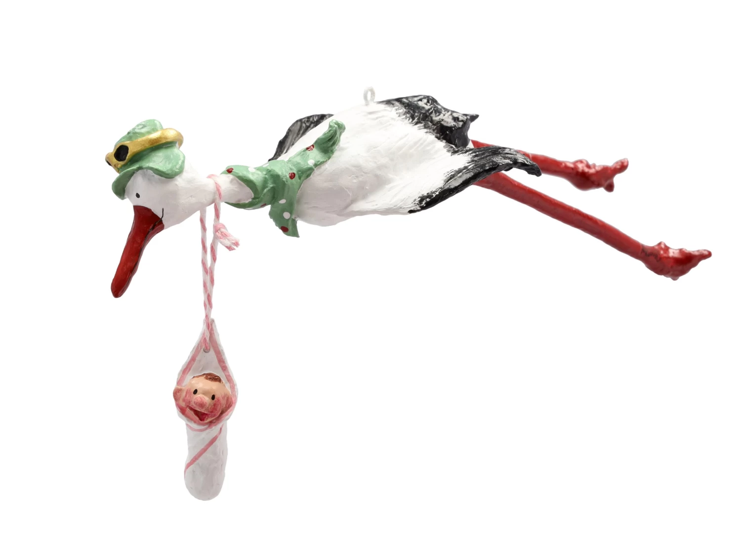 Storch Rasmus kommt stolz mit einem kleinen, neugeborenen Babymädchen angeflogen. Das Baby hängt an einer rosa Schnur und ist in eine Decke mit rosa Kante gehüllt. Storch Rasmus ist eine originelle Geschenkidee für eine Babyshower, einen Besuch bei der frischgebackenen Mutter, zur Taufe oder zum Namensfest.